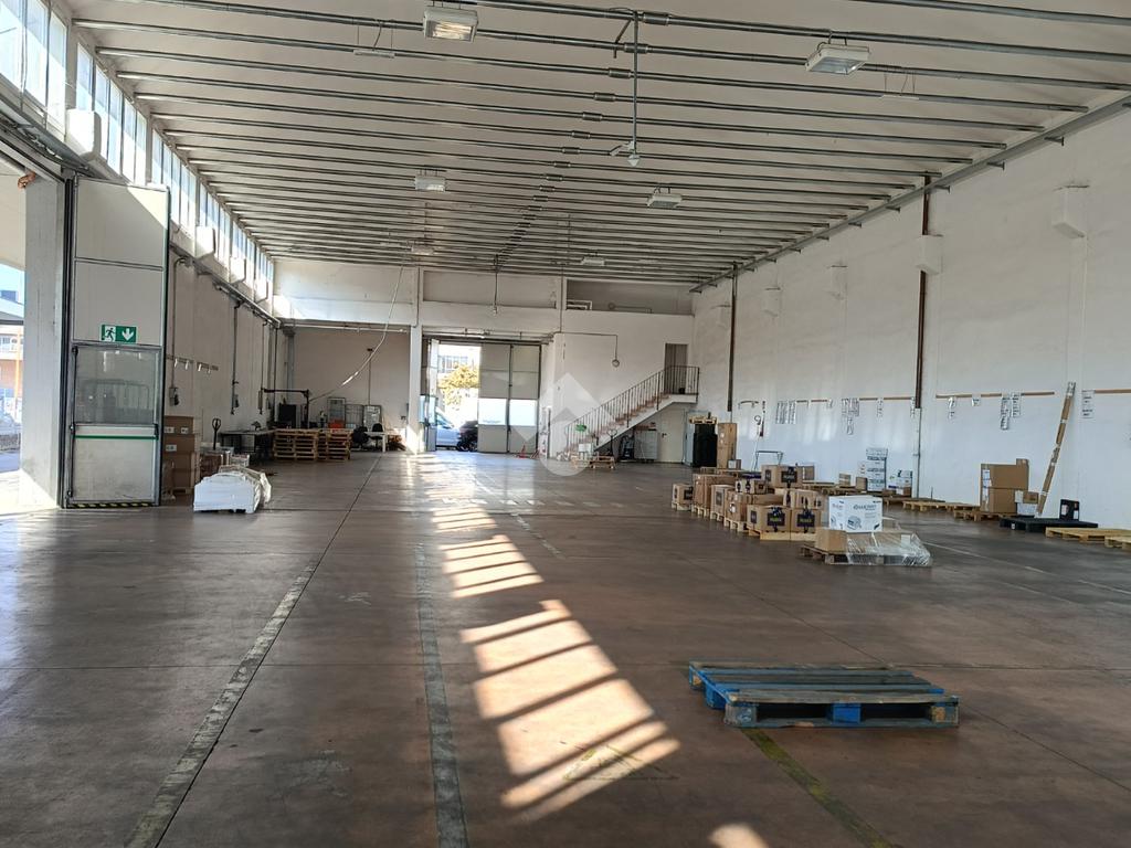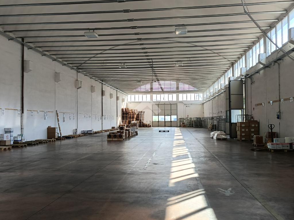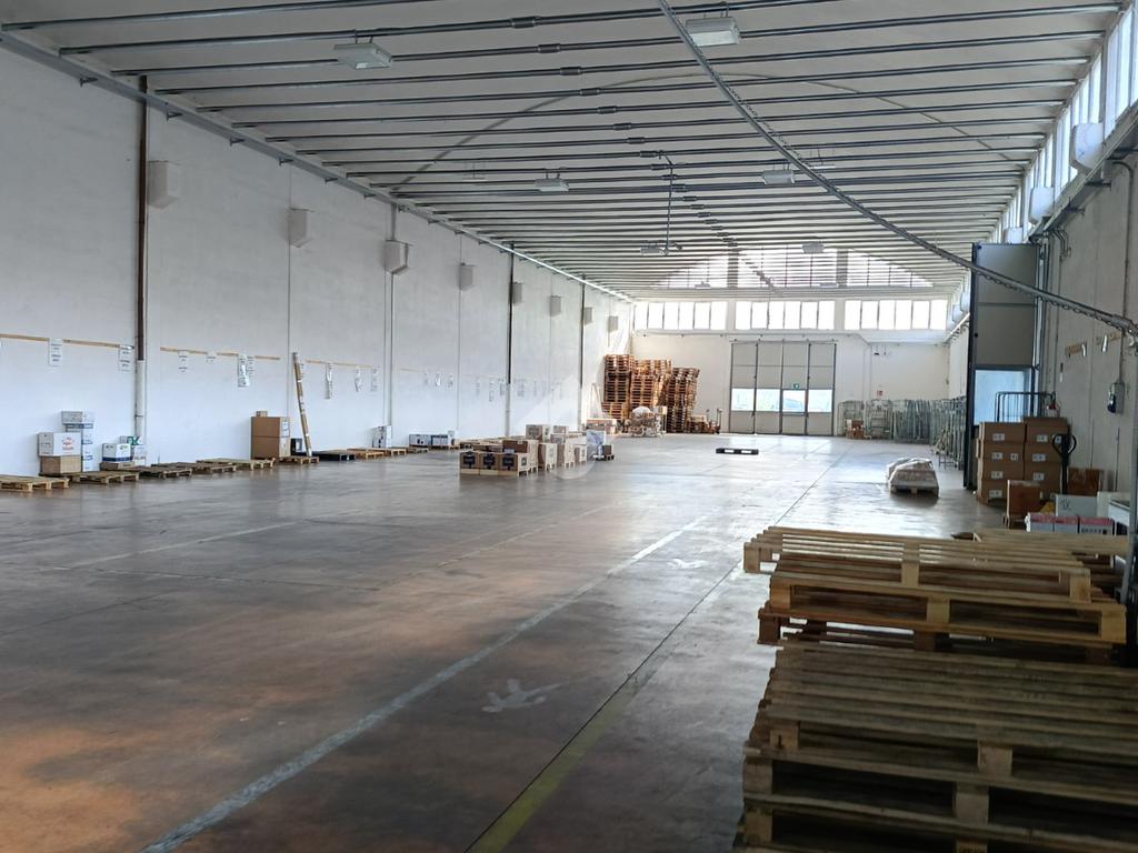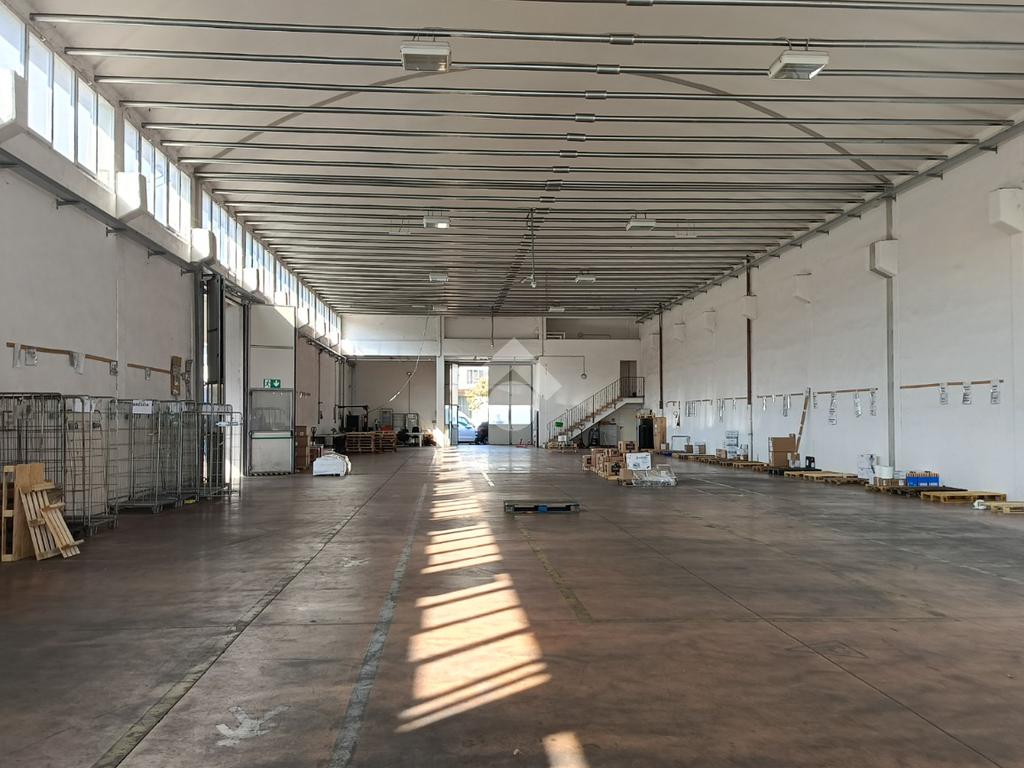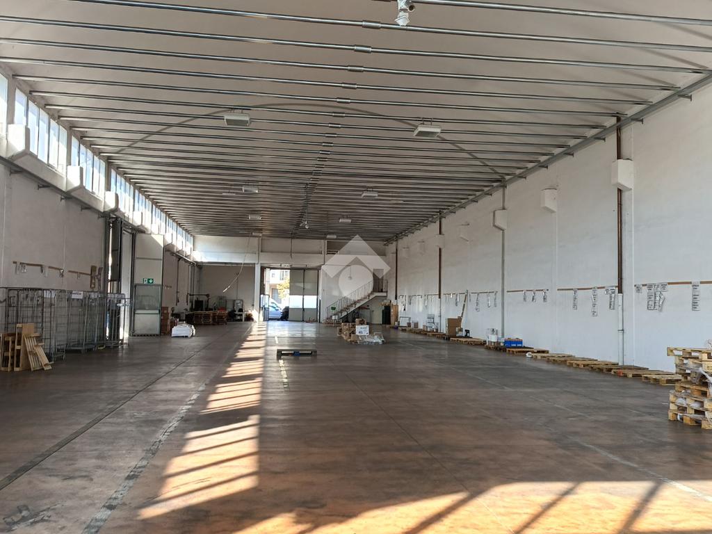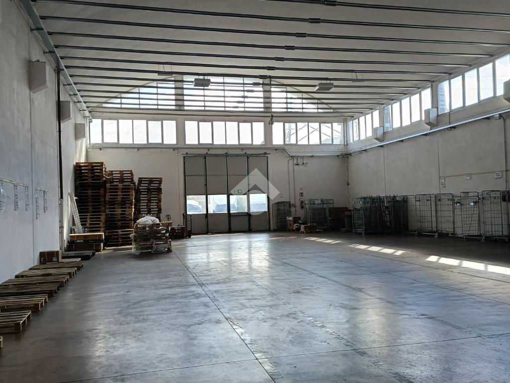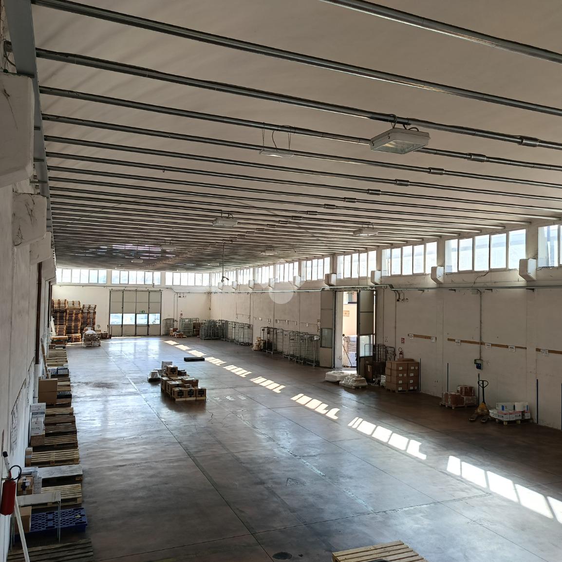Il capannone e' su pianta rettangolare con altezza sotto trave di 7 metri , con superfice di1000 metri quadri e tre portelloni industiali 4m x 5 m , al piano superiore troviamo due servizi igienici e 100 metri di uffici.