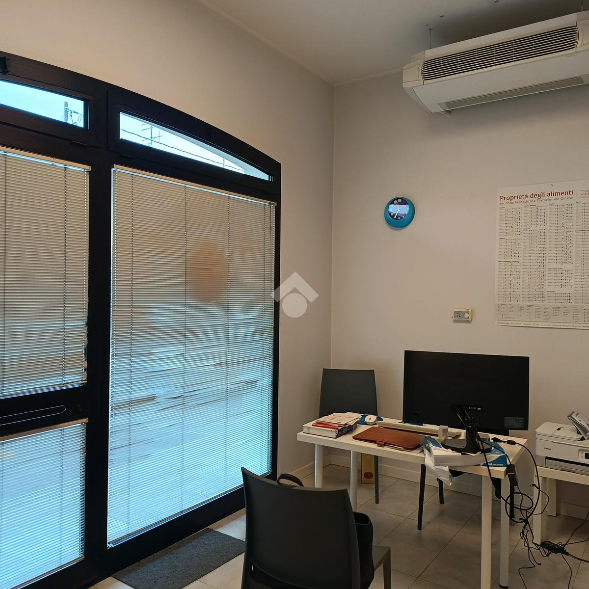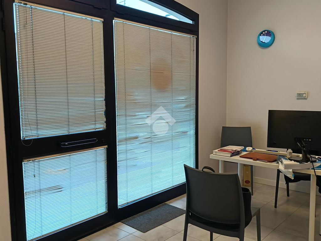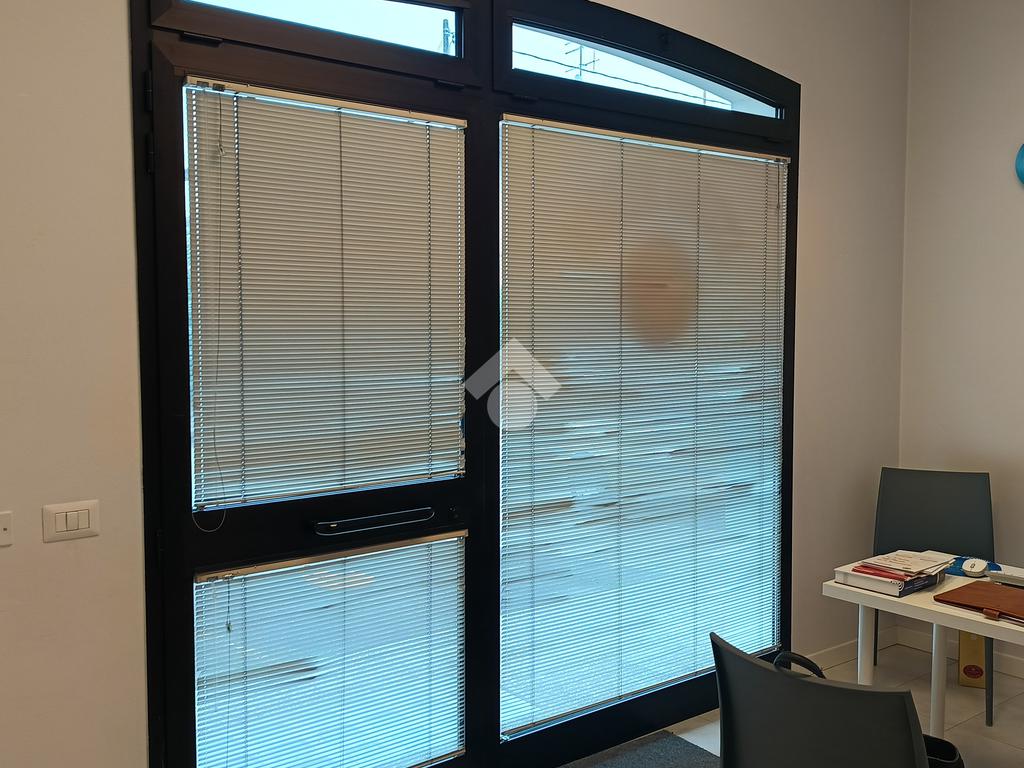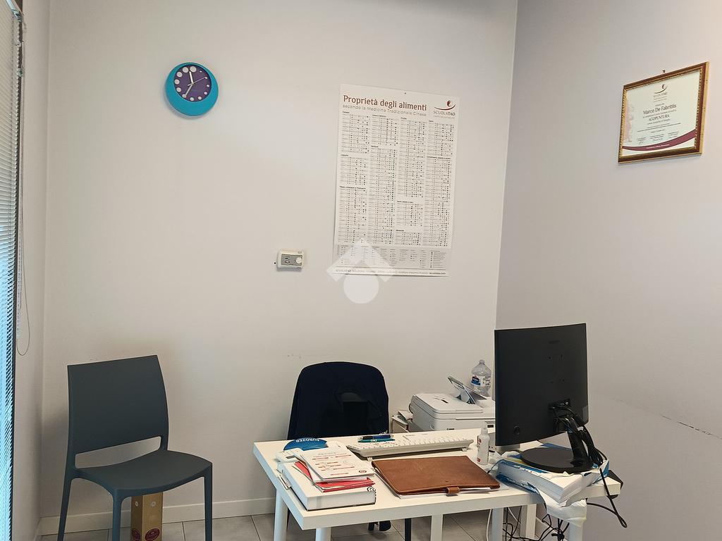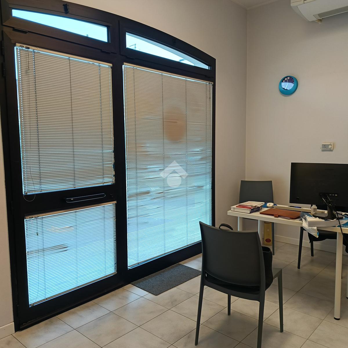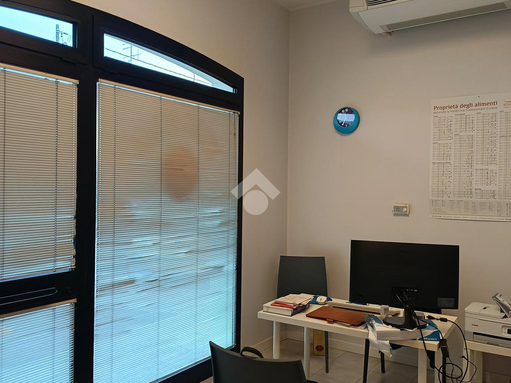 Lo studio è così formato, vetrina su strada con infisso a doppia camera antisfondamento, sala d’attesa e receptions, corridoio e due studi, divisi da una parete mobile, bagno attrezzato per disabili.